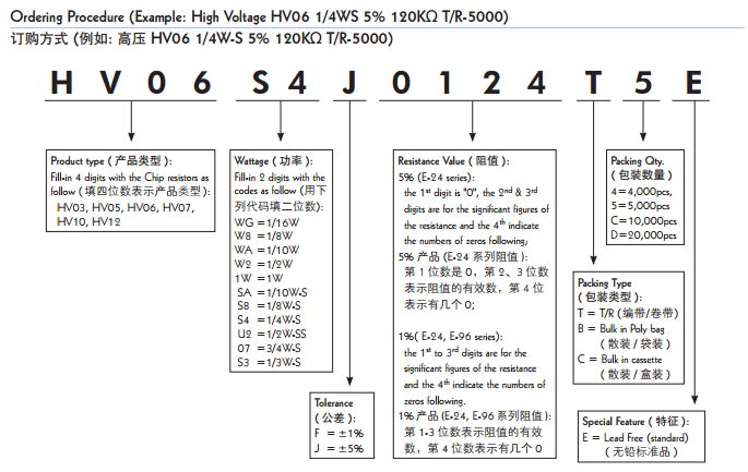 根據(jù)功能用途不同表達型號方式也有區(qū)別,如厚聲的高壓厚膜晶片電阻,型號以字母開頭HV03, HV05, HV06, HV07,HV10, HV12。